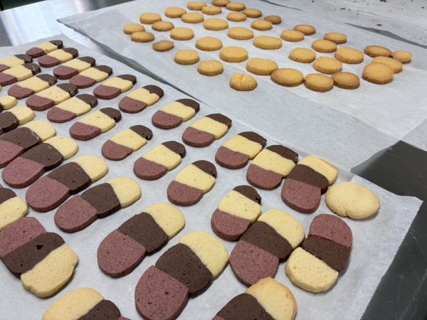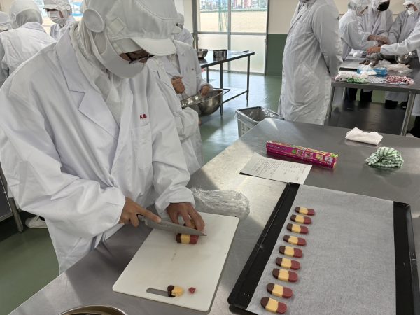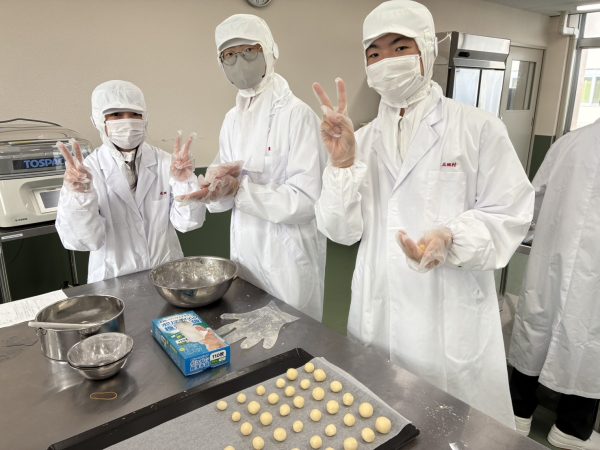 今回は「美味しいクッキーを作る」ことを目標にグループで相談してレシピ考えました。 ジャムクッキー、3色アイスボックスクッキー、スノーボールクッキー、バタークッキー、ココアスノーボールクッキー、チャンククッキーの6種類のオリジナルクッキーを作り、試食しました。その後、アンケートを行い、集計、原価計算をすることで、商品を作り出すこと、価格を決定することなどを学びました。