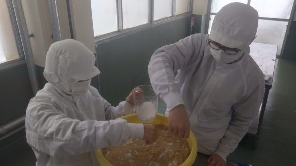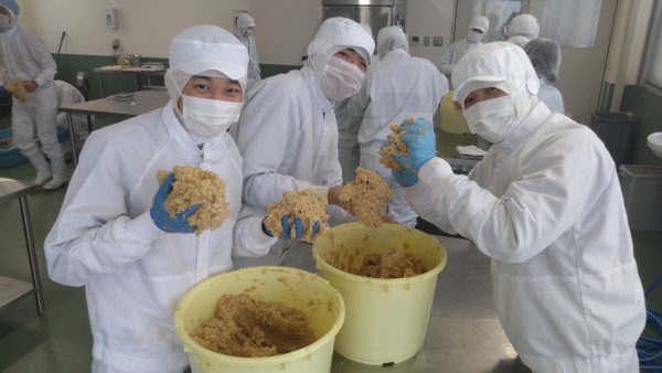 今年も味噌を仕込む季節がやってきました。 米五の味噌から講師をお招きし、味噌造りを教えていただきました。 本校で栽培した「里のほほえみ」を冷たい水で洗い、蒸気釜で蒸し上げ、米麹と塩で混ぜていきます。 米麹と大豆が均等に混ざるよう、力と愛情を込めてつくりました。こちらの味噌は、来年の11月に蔵出ししふれあいマートで販売予定です。現在も昨年仕込んだ味噌を販売中ですので、ぜひご賞味いただければと思います。